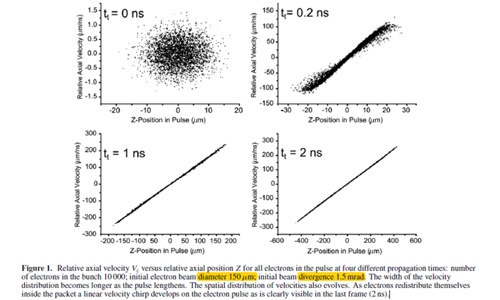 - 传播距离越短,横向动量展宽越大:所以光电阴极尺寸、电子束的密度、电子传播的距离都需要取合适的值来实现低的电子脉冲持续时间。