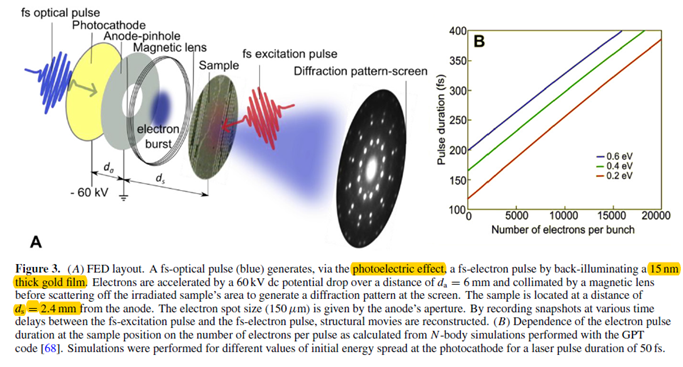 图B是,对于确定几何尺寸的电子枪,在样品位置处的电子持续时间在不同的能量展宽下随每束电子束中的电子数目的关系。降低初始能量展宽可以降低电子脉冲持续时间。使用金作为光电阴极可以使光电发射的初始电子能量展宽降低至0.2eV。